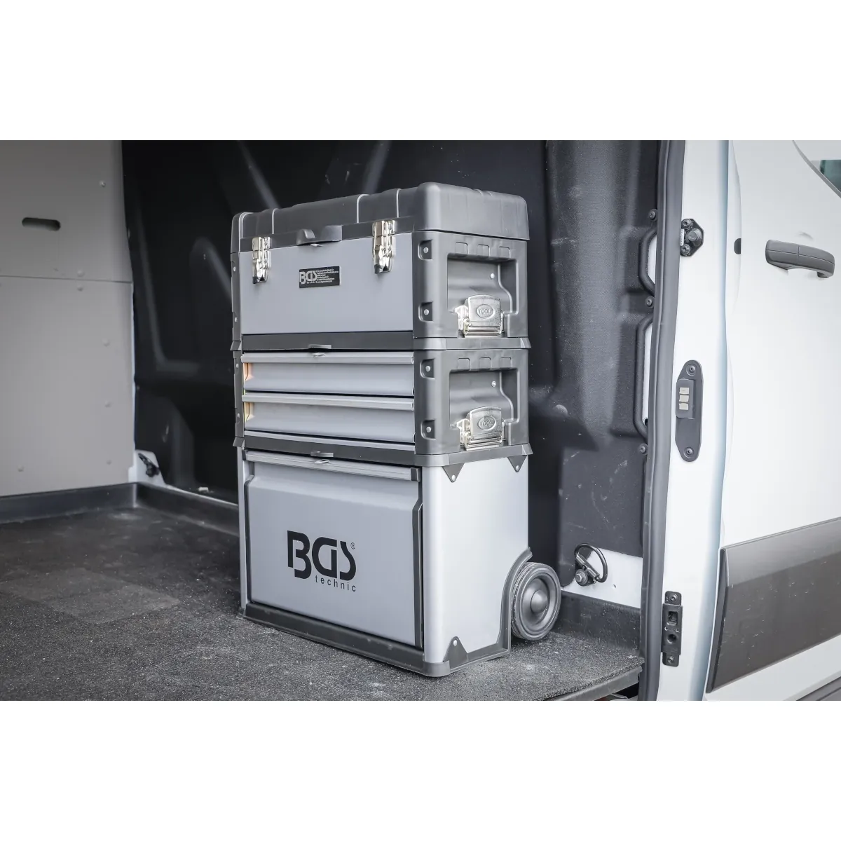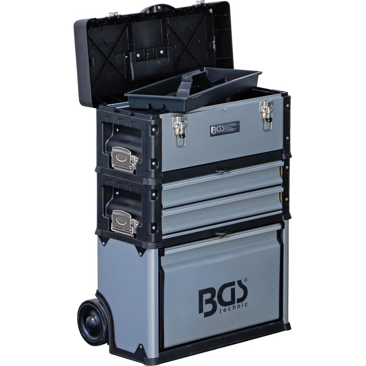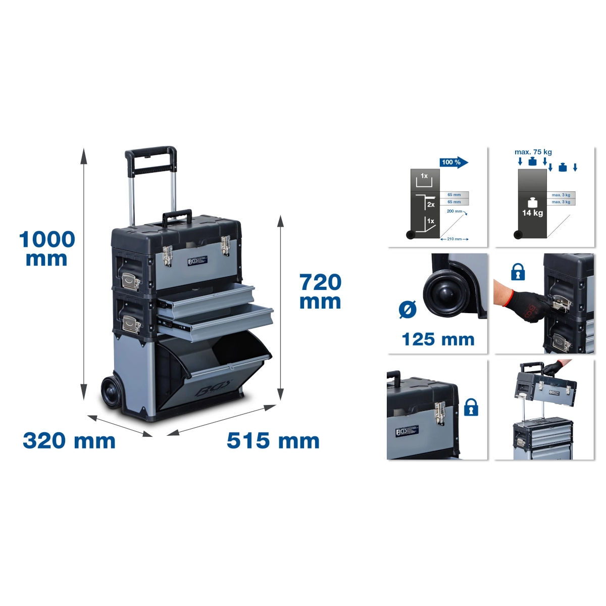 consta de tres partes desmontables: 1 caja con tapa abatible y asa de transporte, 2 cajones, 1 compartimento